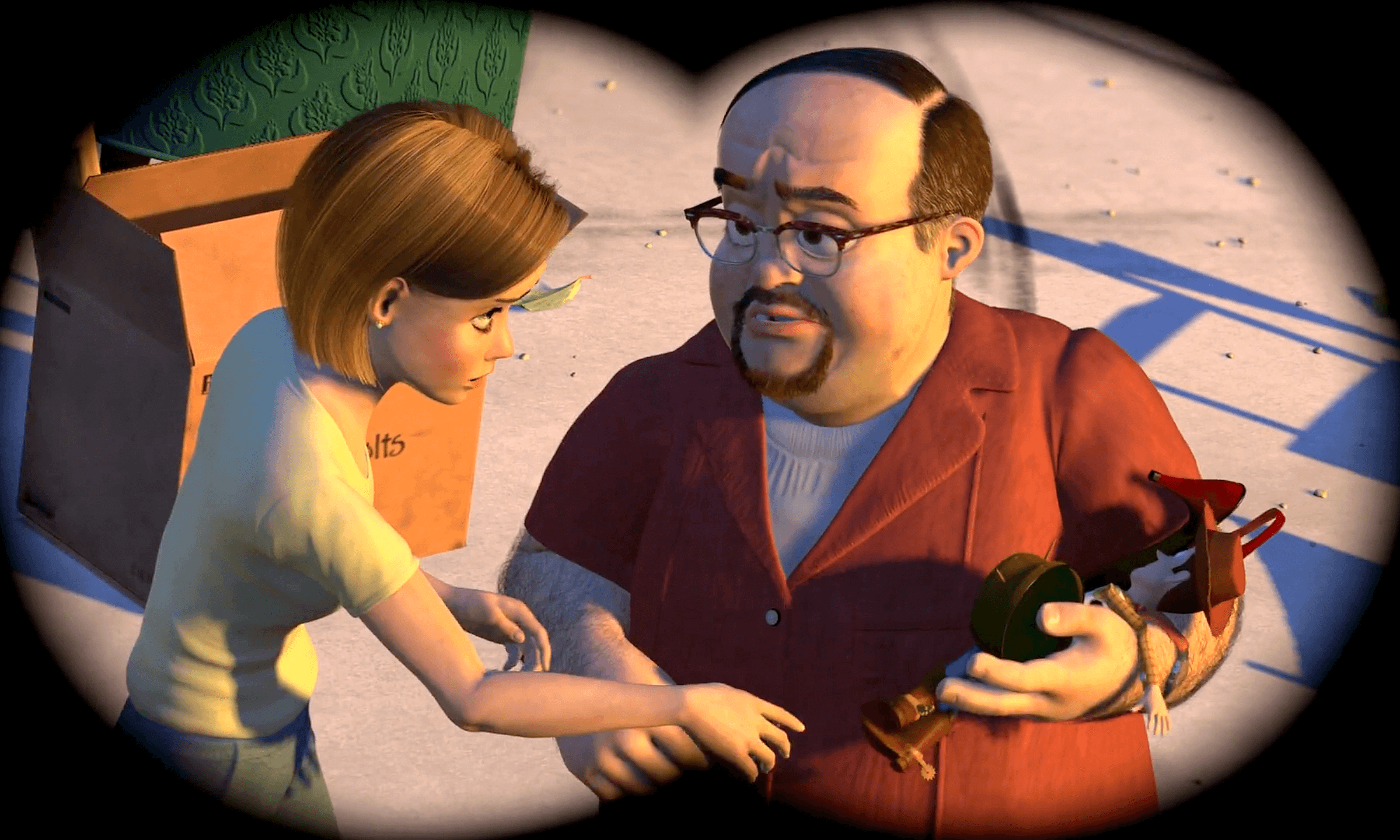 그러나 갑자기 TV가 켜지면서 알이 잠에서 깨어나고, 우디는 다시 진열장에 넣어지게 되죠.