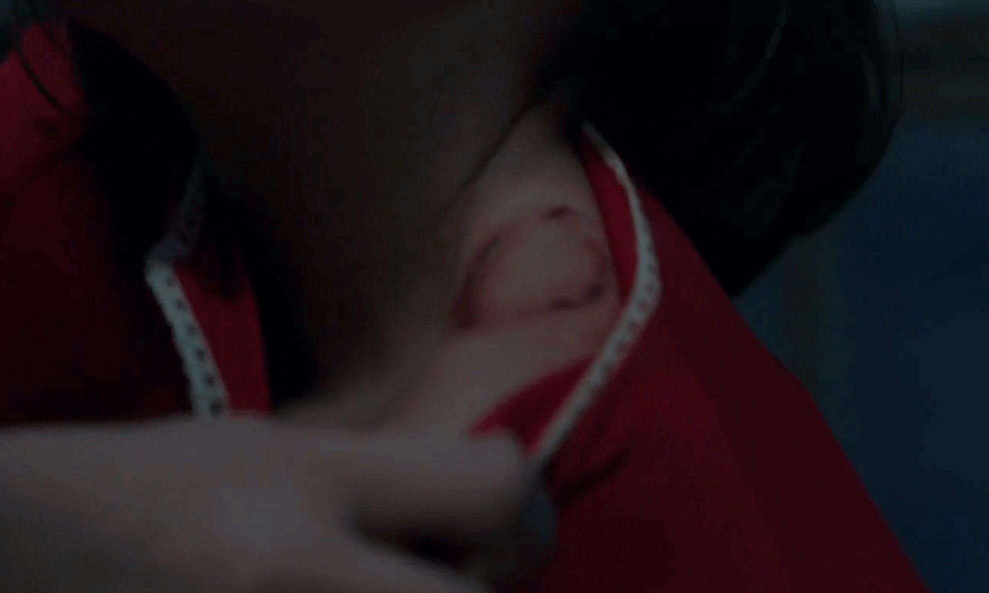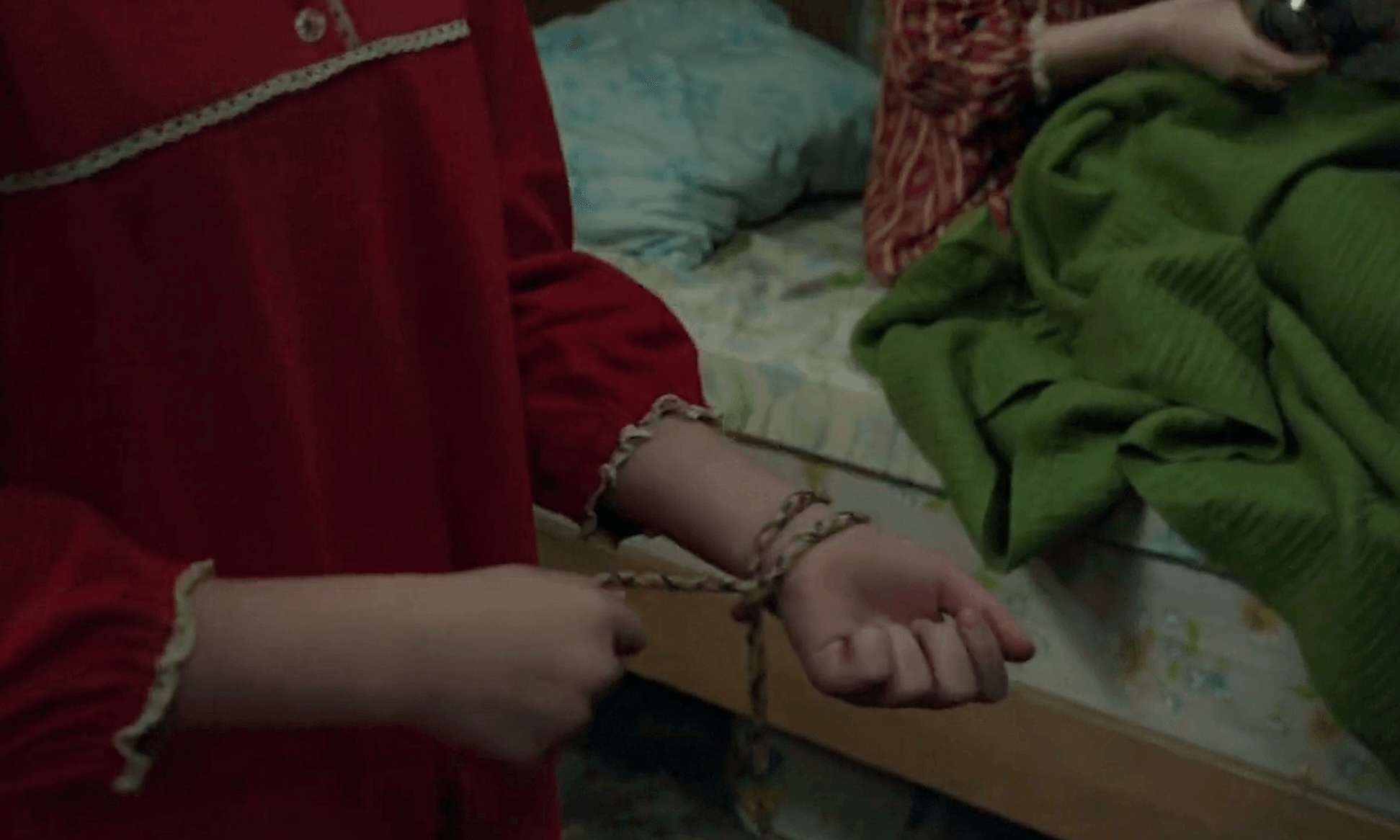 # 악령에 끌려갈까 두려워 잠들기 전 자신의 손을 침대와 연결하는 자넷 호지슨(매디슨 울프)