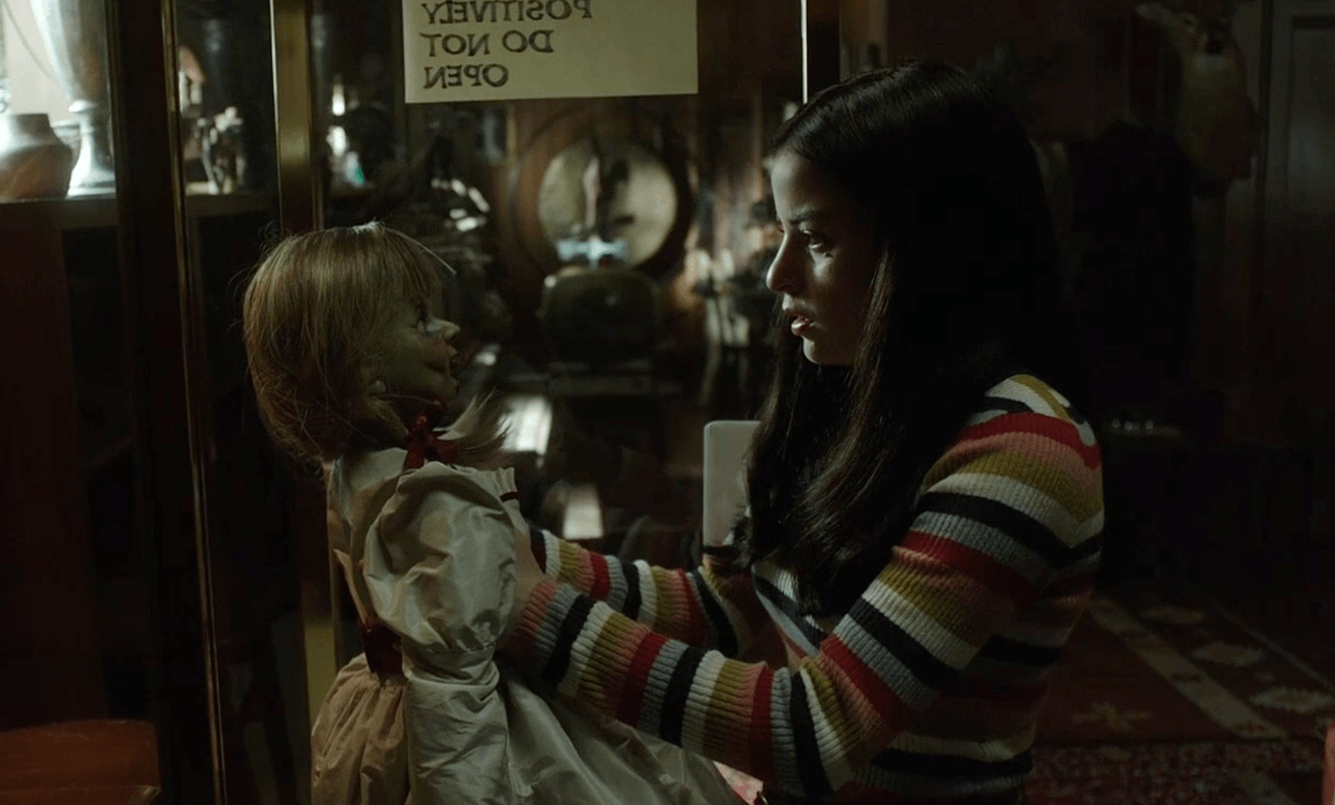 # ‘경고 절대 열지 마시오’라고 적힌 진열장에서 애나벨을 꺼내는 다니엘라