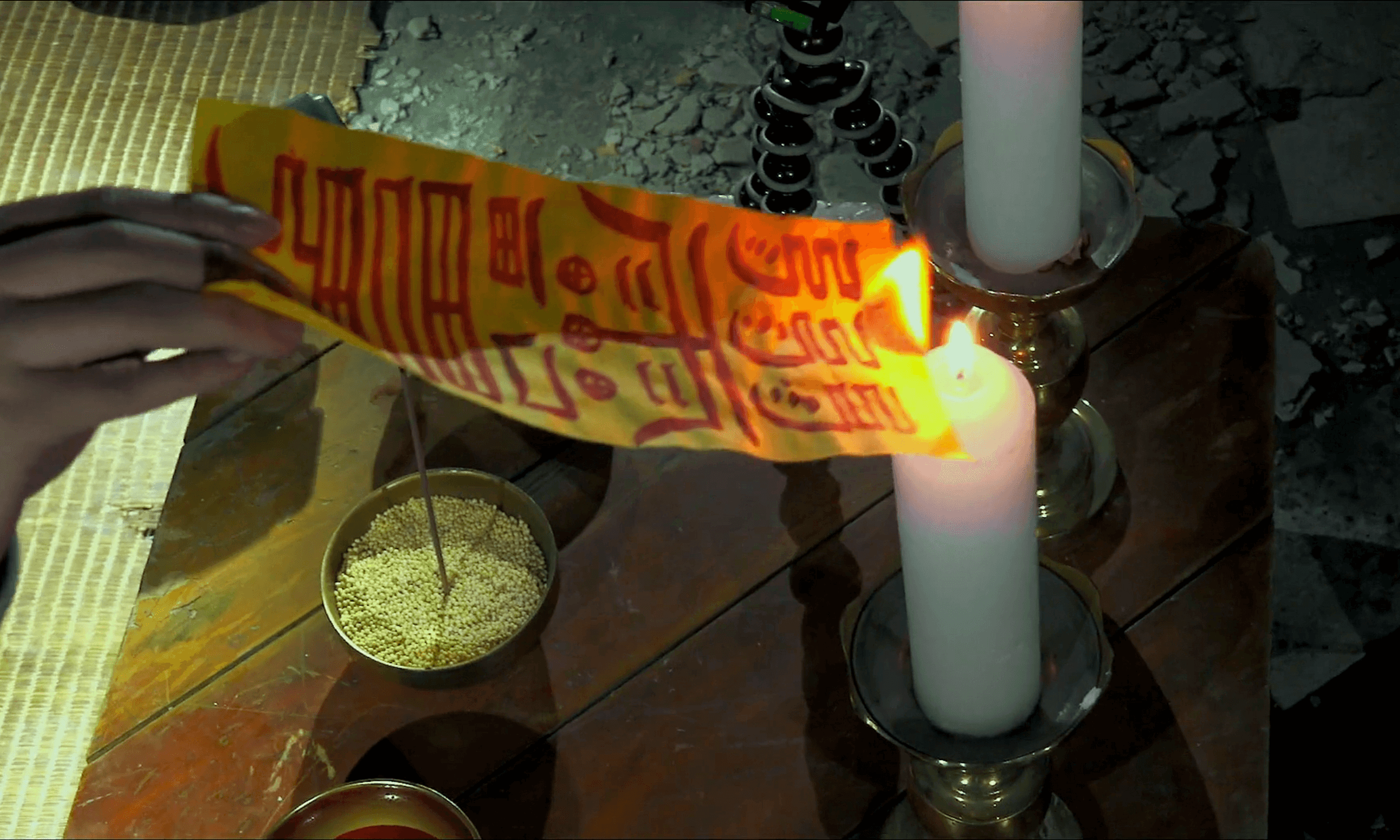 이 자리에서 귀신을 부르기 위해 향을 피우고 부적을 태웠다.