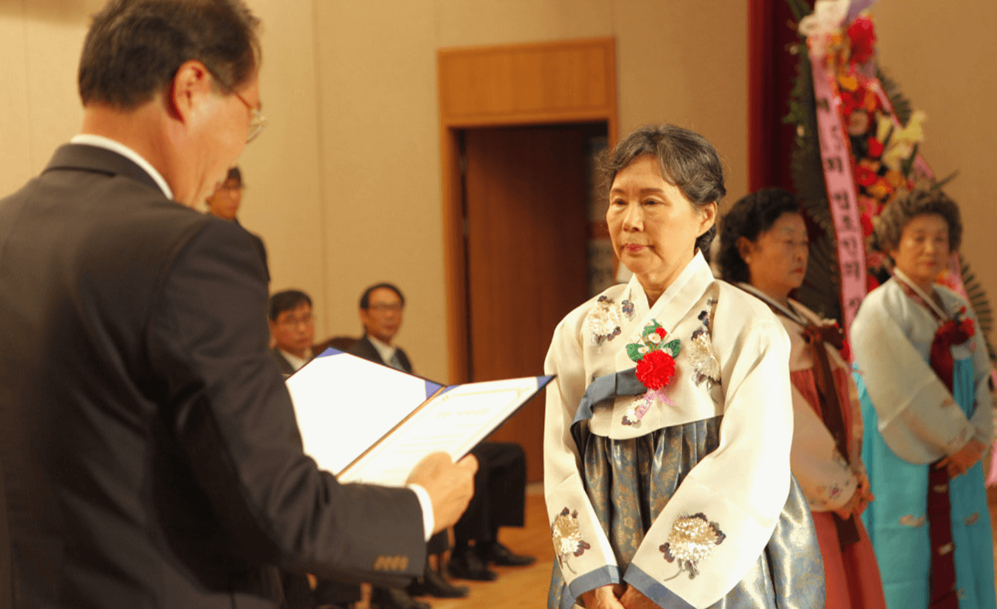 # 대검찰청에서 주관하는 시상식에서 장한 어머니상을 받는 옥님 할머니